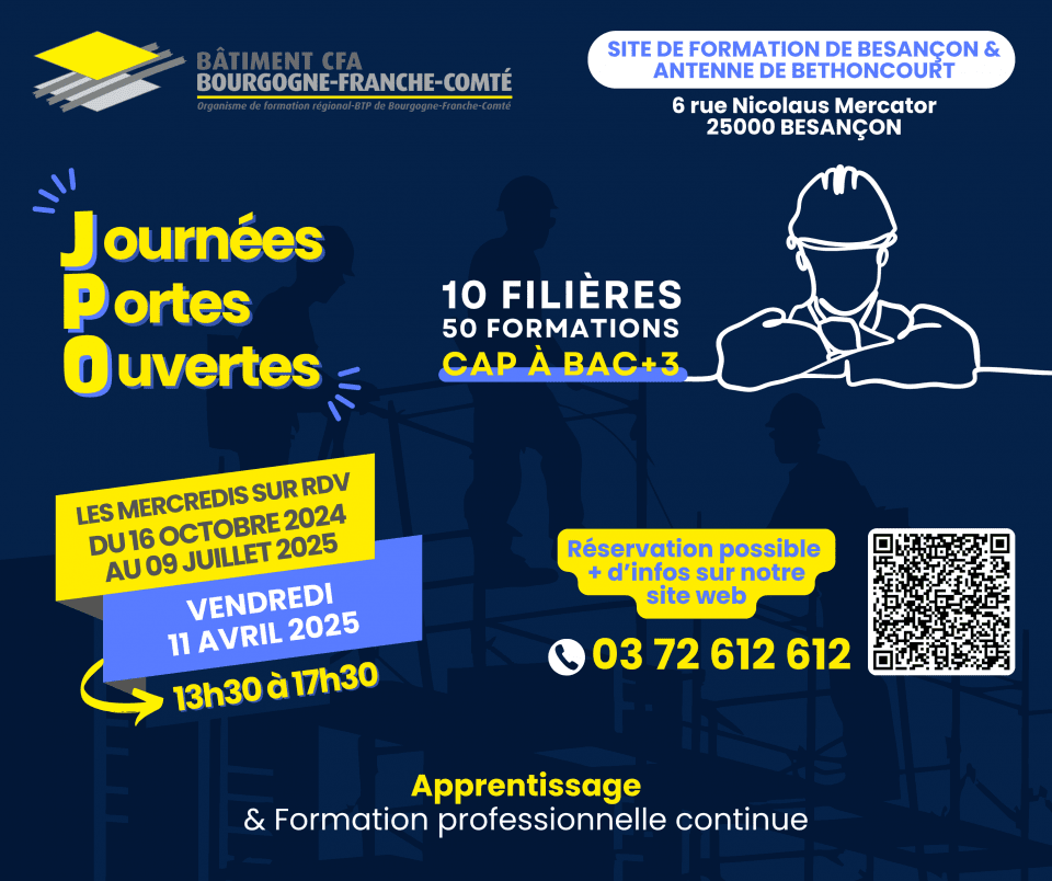 Vendredi 11 avril 2025, Bâtiment CFA Bourgogne-Franche-Comté – Site de Besançon organise une Journée Portes Ouvertes de 13h30 à 17h30.